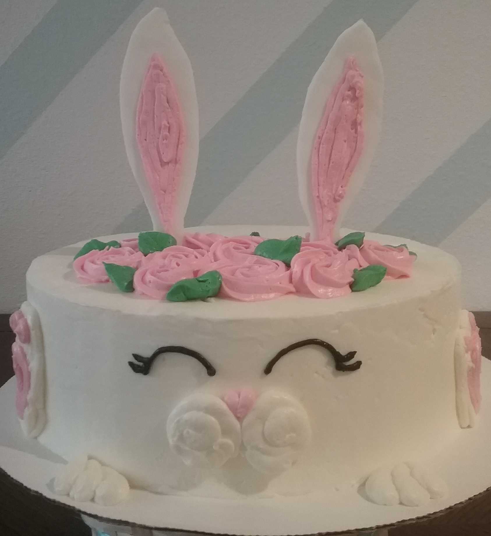 Round cake with bunny face piped onto the front side of the cake in frosting, with fondant ears sticking out of the top of the cake and a floral headband.