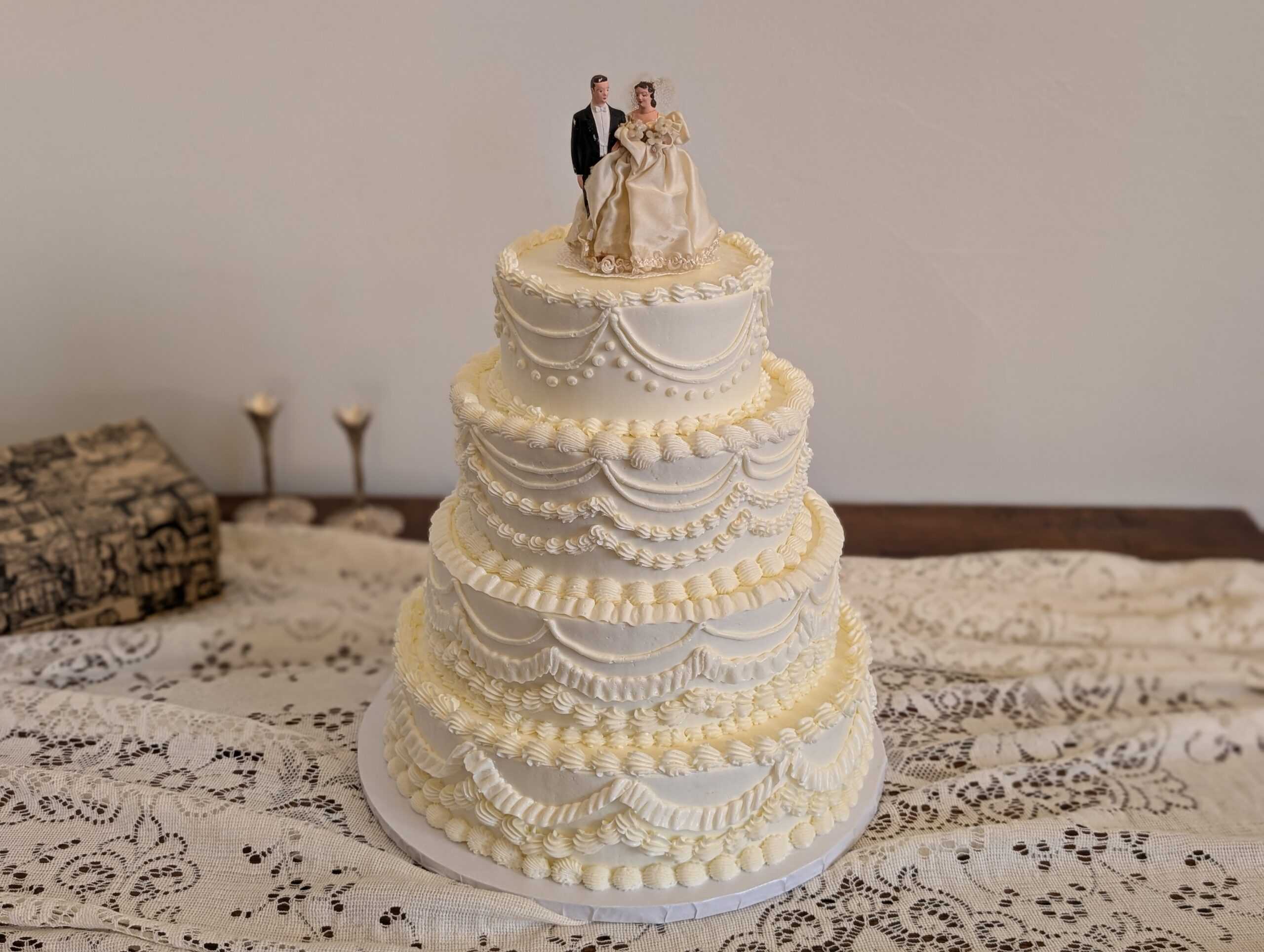 This timeless four-tier wedding cake features smooth white buttercream and intricate hand-piped details, including elegant swags, scalloped borders, rosettes, and pearl-style accents. The graduated tiers create a refined, traditional silhouette—perfect for couples who love a classic, heirloom-inspired look.