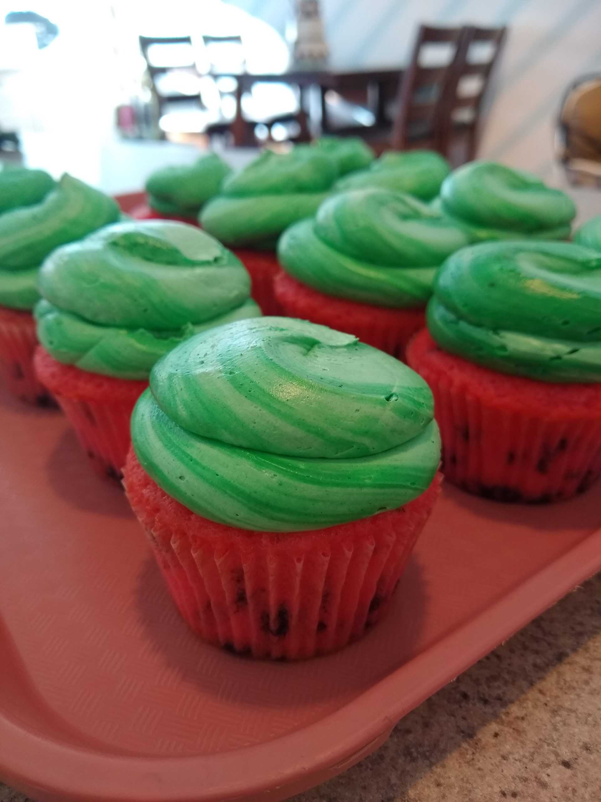 Pink watermelon flavored cupcakes with chocolate sprinkles mixed in, topped with green striped watermelon flavored frosting.